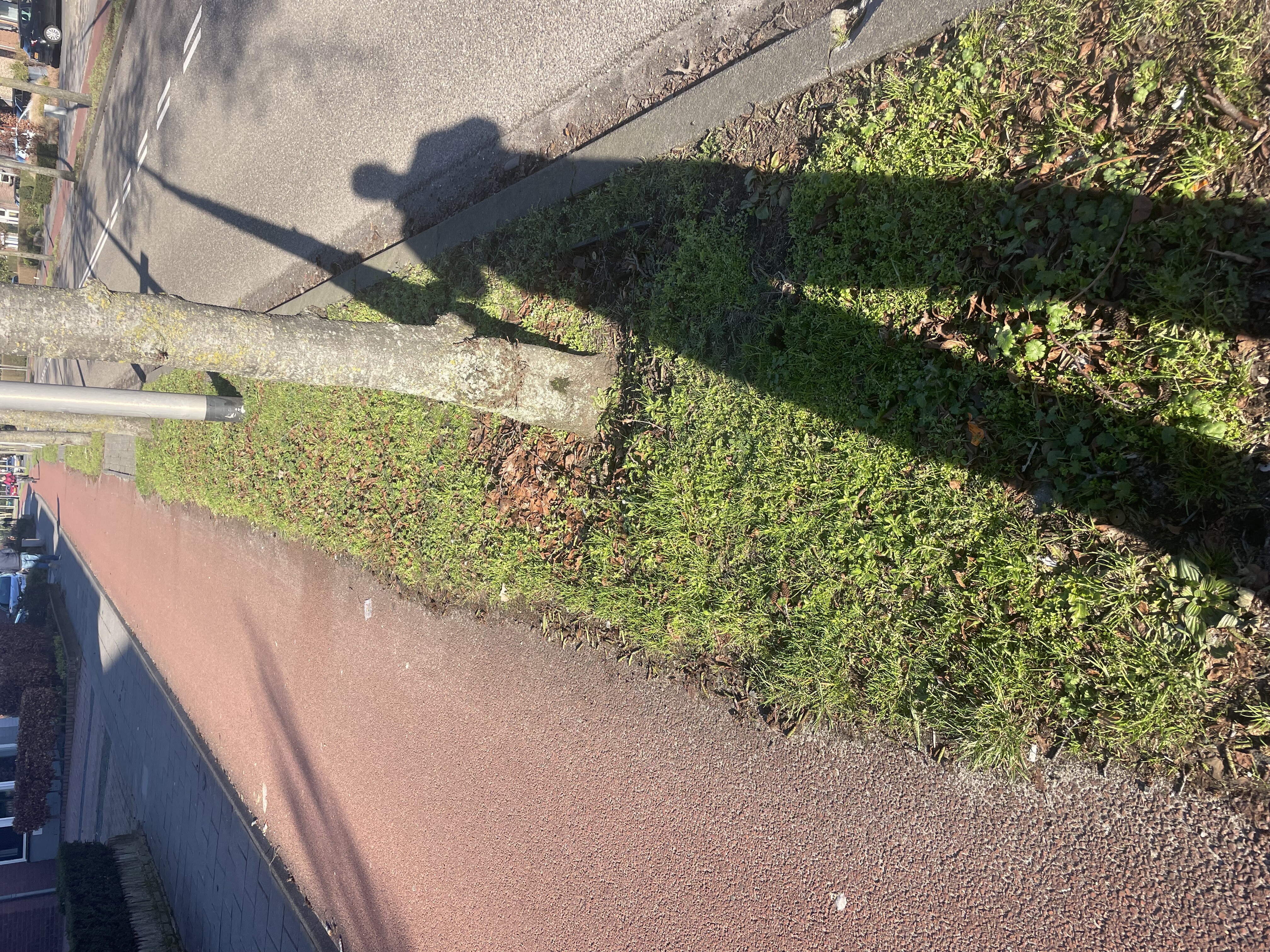 Groenstrook tussen fietspad en weg heeft meer nodig dan onkruid en lelijke bomen, bijvoorbeeld een heg of ander groenblijvende struik. (taxus haag), (groenblijvende liguster)