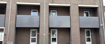 Geveltuintjes tegen de pilaren van het gebouw aan, zie foto