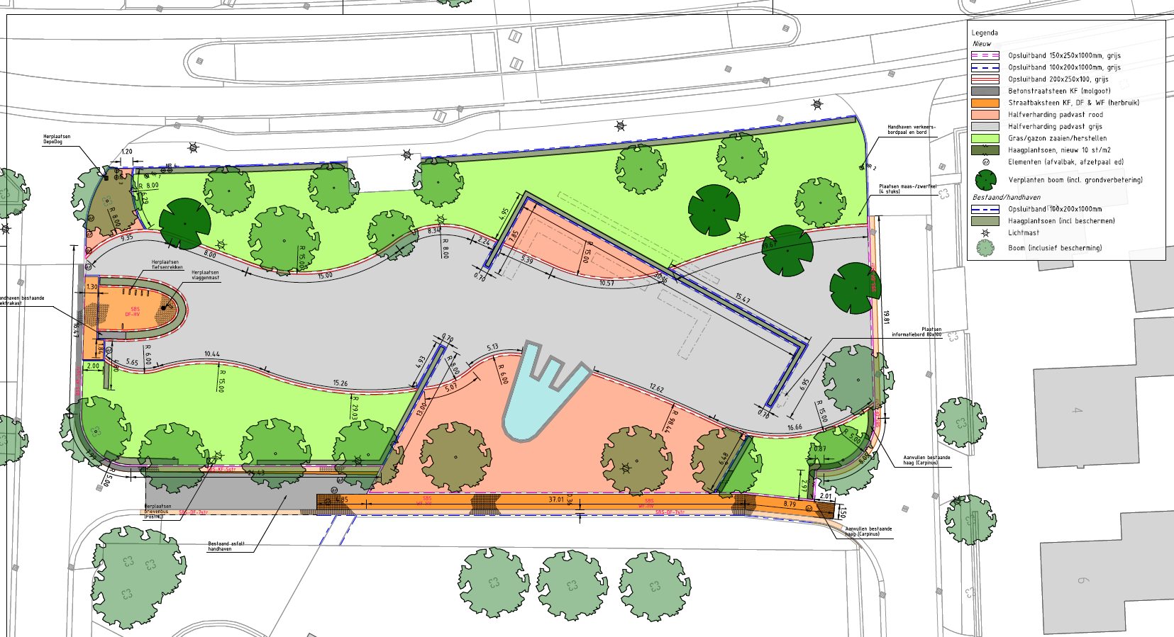 Het vervuilde split wordt afgegraven en vervangen door Achterhoeks Padvast. Daarnaast gaan we enkele bomen, die nu dicht op elkaar staan, verplaatsen, zodat deze bomen meer groeiruimte krijgen. De geasfalteerde weg tussen de kerk en het Kerkplein, die is afgesloten met paaltjes, gaan wij versmallen en vervangen door een aantrekkelijk pad van gebakken stenen.