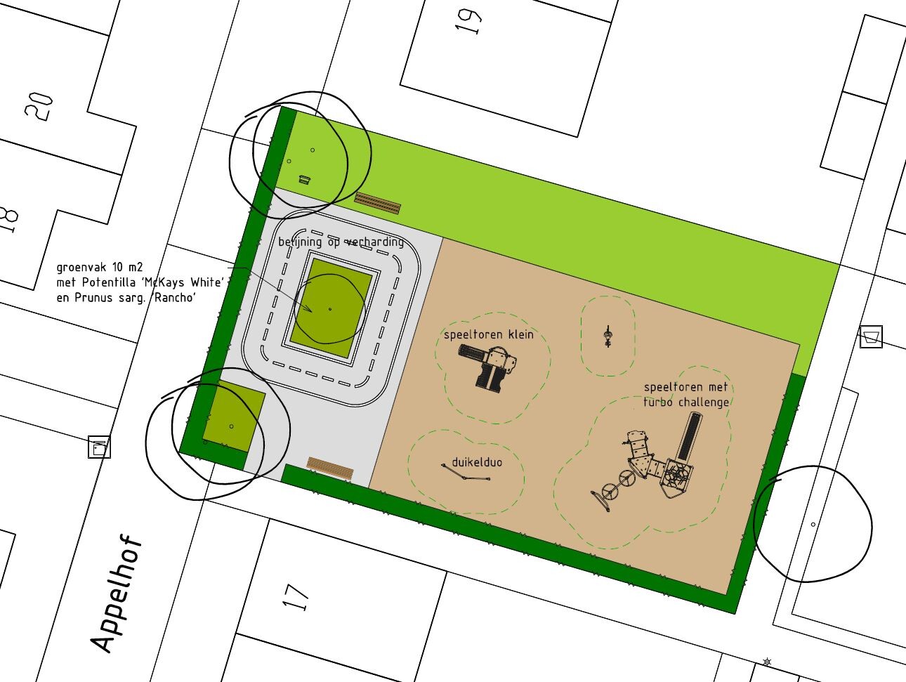 De gemeente gaat op het pleintje belijning aanbrengen voor een fietsparcours voor kleine kinderen. In het midden van het pleintje planten we een boom en struiken.