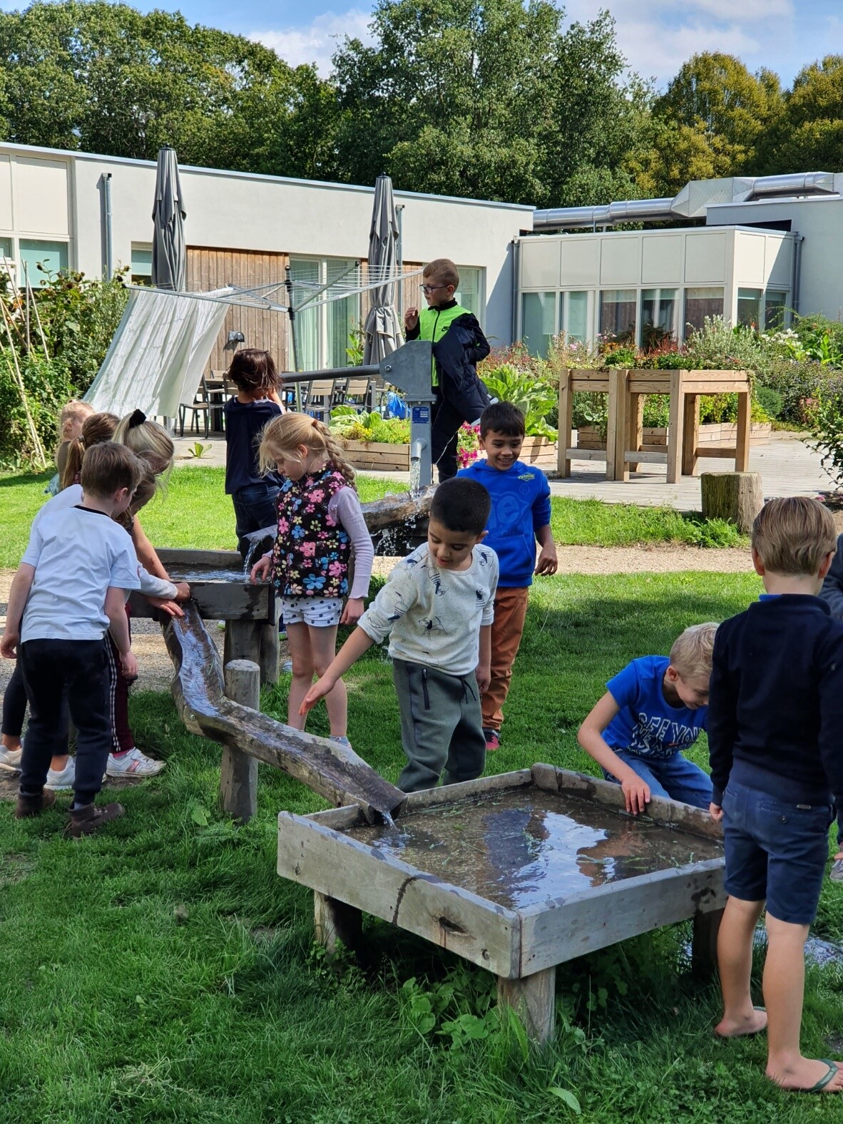 Er wordt volop gebruik gemaakt van dit mooie speelpad. Kinderen spelen en beleven er met elkaar allerlei avonturen. Hun ouders en grootouders genieten van hun (klein)kinderen en bespreken de laatste nieuwtjes uit de buurt. En ja, natuurlijk is er ook een buurman die gezellig een kan koffie mee heeft genomen. Oh en kijk, in de buurttuin bij het Elzeneindhuis wordt gewerkt door de kinderen uit de buurt en twee van de bewoners van het Elzeneindhuis. Ook een opa die langs het pad woont helpt mee en geeft uitleg over de aardbeitjes die er groeien. En dat het zo lekker en gezellig is om daar samen jam van te maken. Omdat de moestuin op hoogte is gemaakt kunnen de bewoners ook goed met hun handen tussen de groenten. Daar komen nog twee kinderen aan. De een duwt de rolstoel van de ander. Ze zijn onderweg naar de aangepaste schommel waar ze samen in kunnen.
