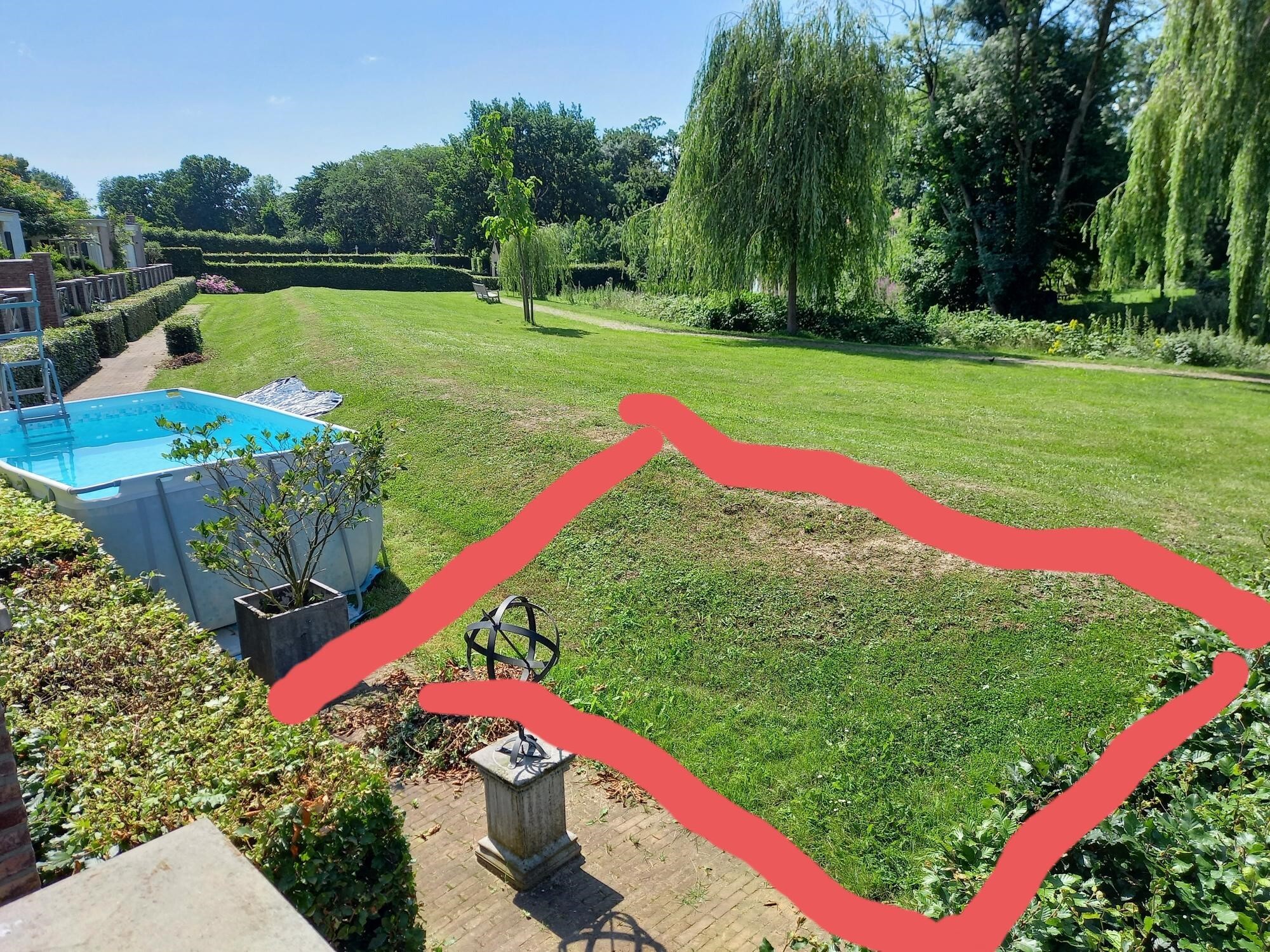 Achter onze woning ligt een ontsluitingspad, met een groot grasveld. Tegen het ontsluitingspad begint het grasveld met een verhoging. Ter plaatse van die verhoging, zou ik graag zien, dat er een bijentuin komt. Het is een lastig te maaien deel, waardoor het er kaal uitziet, het gras is bovenop weg, zie foto's.